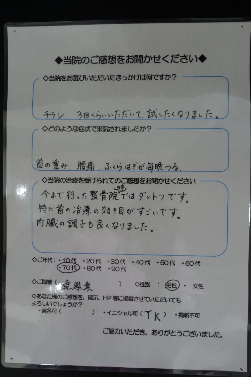 首の重み、腰痛、ふくらはぎが毎晩つるといった症状に悩んでいたところに、